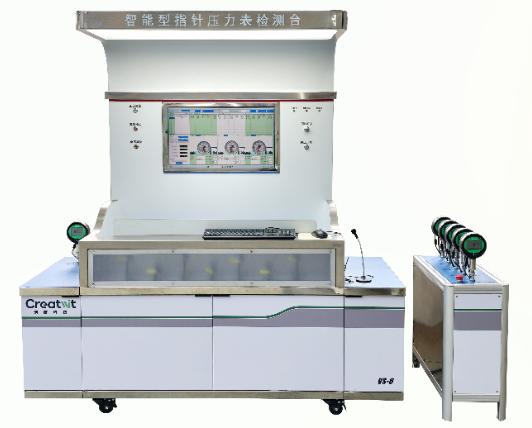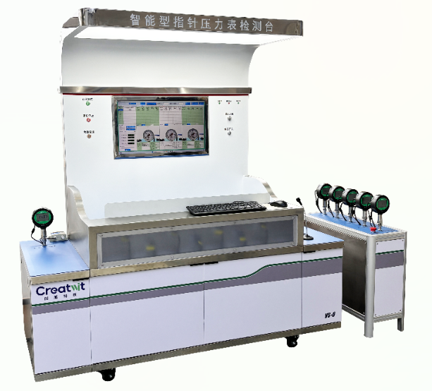 智能型指針壓力表檢測臺是一款指針壓力表的全自動檢測設備,它能按“規(guī)程要求”將介質壓力精確地控制到各個檢定點壓力,然后自動拍攝被檢表在輕敲前、輕敲后的實時照片,通過機器視覺技術自動讀取、記錄照片上的指針“示值”,實現(xiàn)對指針壓力表的自動檢定(校準)。