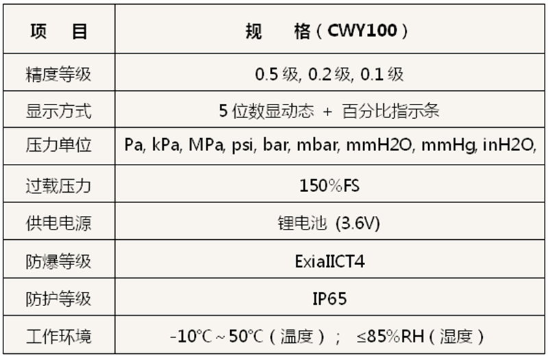 CWY100軸向精密數(shù)字壓力表,是陜西創(chuàng)威按照標(biāo)準(zhǔn)研制生產(chǎn)的高精度智能壓力測(cè)量?jī)x表。CWY系列數(shù)字壓力表主要由壓力傳感器和信號(hào)處理電路組成,采用進(jìn)口的壓力傳感器,性能優(yōu)越,具有精度高、抗腐蝕性、抗沖擊、抗震動(dòng)、低溫漂、高穩(wěn)定性等優(yōu)點(diǎn);信號(hào)處理電路采用最新的超低功耗處理器、信號(hào)處理芯片及電源管理芯片組成。采用大容量高性能鋰電池供電,無(wú)需外部電源供電。該儀表外觀精致、小巧、美觀,使用操作簡(jiǎn)單。