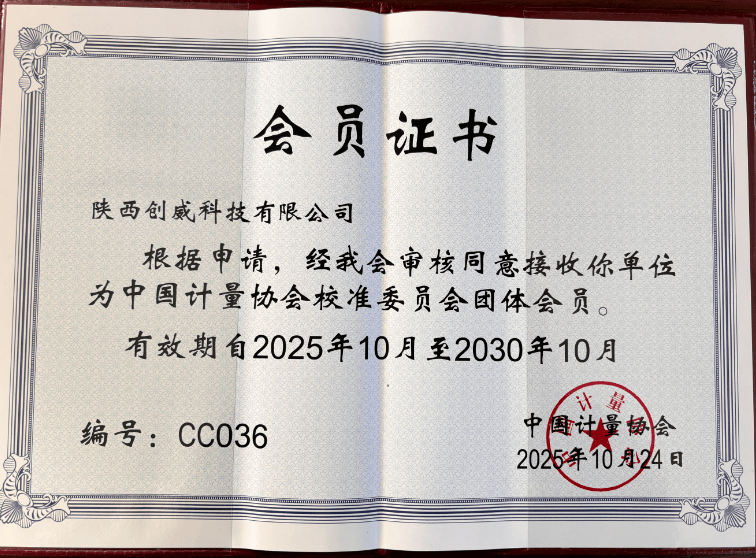 近日,陜西創(chuàng)威科技有限公司憑借卓越的技術(shù)實力、規(guī)范的管理體系與良好的行業(yè)聲譽,正式通過審核,被接收為“中國計量協(xié)會校準(zhǔn)委員會團(tuán)體會員”。會員資格有效期自 2025年10月至2030年10月,為期五年。