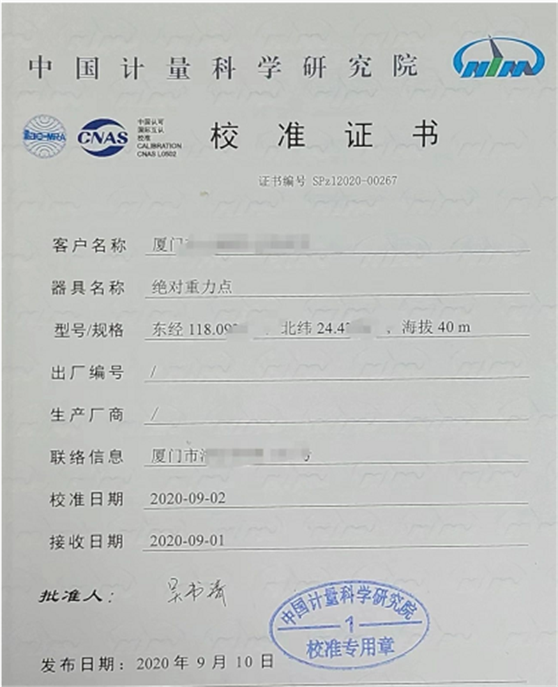 我們以創(chuàng)威公司廈門某客戶為例。2020年,廈門某技術(shù)機(jī)構(gòu)購買了創(chuàng)威公司3臺0.005級的活塞式壓力計,其中有1臺氣體真空活塞式壓力計、2臺全自動活塞式壓力計,量程區(qū)間為-0.1~60MPa。同時全權(quán)委托創(chuàng)威公司對其實驗室進(jìn)行重力加速度的實地測量,并出具國家機(jī)構(gòu)的測試校準(zhǔn)證書。