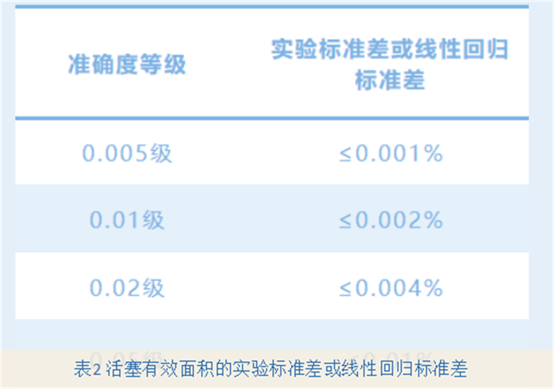 測(cè)量范圍上限為25MPa及以上的壓力計(jì),活塞有效面積的線性回歸標(biāo)準(zhǔn)差應(yīng)符合表2的規(guī)定。