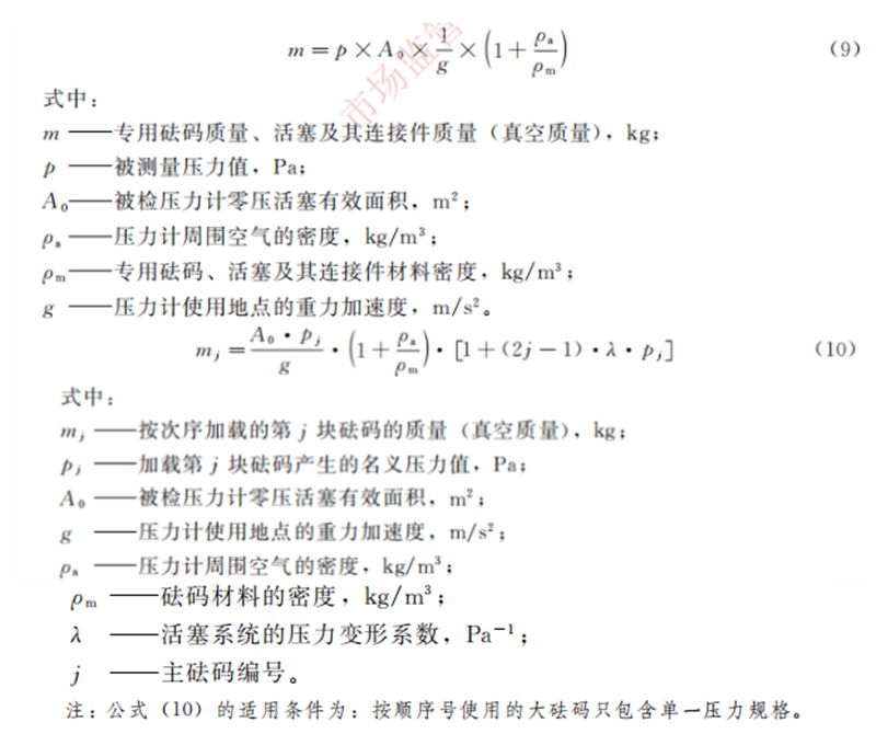 調(diào)整的內(nèi)容:測(cè)量范圍上限為25MPa及以上的壓力計(jì),若配套的專用砝碼是標(biāo)稱壓力值的,則按順序號(hào)使用的大砝碼質(zhì)量按公式(10)計(jì)算,活塞及其連接零件和不按順序使用的砝碼質(zhì)量按公式(9)計(jì)算。