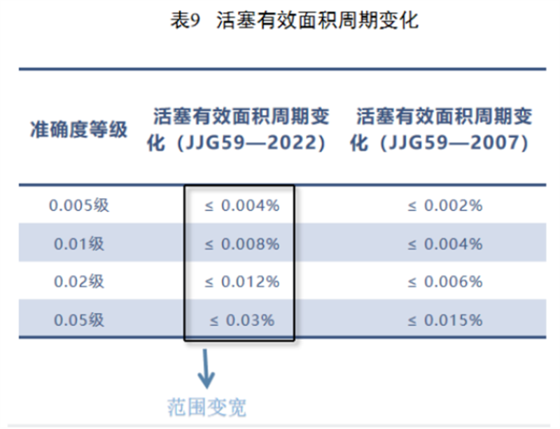2007版規(guī)程規(guī)定的0.01級(jí)專用砝碼質(zhì)量最大允許誤差為±0.003%,新規(guī)程變更為±0.002%。(2022版中對(duì)活塞及其連接件質(zhì)量作了和專用砝碼質(zhì)量最大允許誤差同樣的規(guī)定,2007版中只有專用砝碼質(zhì)量要求。
