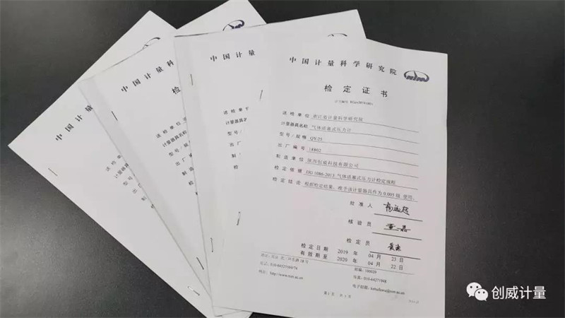 近日,陜西創(chuàng)威科技有限公司為浙江省計(jì)量科學(xué)研究院制造的基準(zhǔn)級(jí)0.005級(jí)氣體活塞壓力計(jì),順利通過驗(yàn)收。本次交付的產(chǎn)品為:四個(gè)不同活塞公稱面積,即1平方厘米、2平方厘米、5平方厘米、10平方厘米的活塞各一套。均為讀數(shù)精度十萬分之五的氣體活塞式壓力計(jì)。量程分別為(0.05-2.5)MPa和(5-400)KPa,以及氣體活塞顯示工作指示器等附件。 客戶驗(yàn)收的,不僅僅是取得中國計(jì)量科學(xué)院的《檢定證書》,更是活塞系統(tǒng)性能的綜合評(píng)價(jià),比如活塞轉(zhuǎn)動(dòng)延續(xù)時(shí)間不小于4min,活塞下降速度不大于1.0mm/min,活塞系統(tǒng)的鑒別閾等因素。 圖:取得國家院《檢定證書》